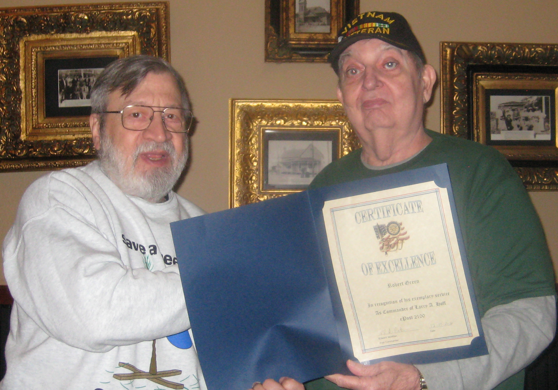 SURPRISED BOB RECEIVES (FROM ED) THE 2015 LEGIONAIRRE OF THE YEAR AWARD AT OUR DINNER